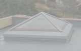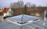 Einfamilienhauses. In diesem Fall wurde das Flachdach-Fenster auf Wunsch unserer Kundin über dem Treppenaufgang in den Dachfirst eingebaut. Das Fenster erlaubt eine gute Entlüftung, da ein horizontaler Winddurchzug