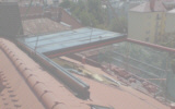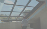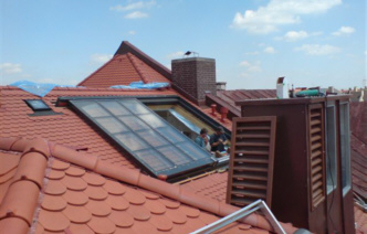 Schiebefenster über der DachflächeEinflügeliges DachschiebefensterDer Schiebeflügel wird über seitliche Laufschienen über die Dachhaut geschobenÖffnungsfläche: 100%Im Bild mit innen liegenden SprossenElementgröße: 2,40 x 3,50 m